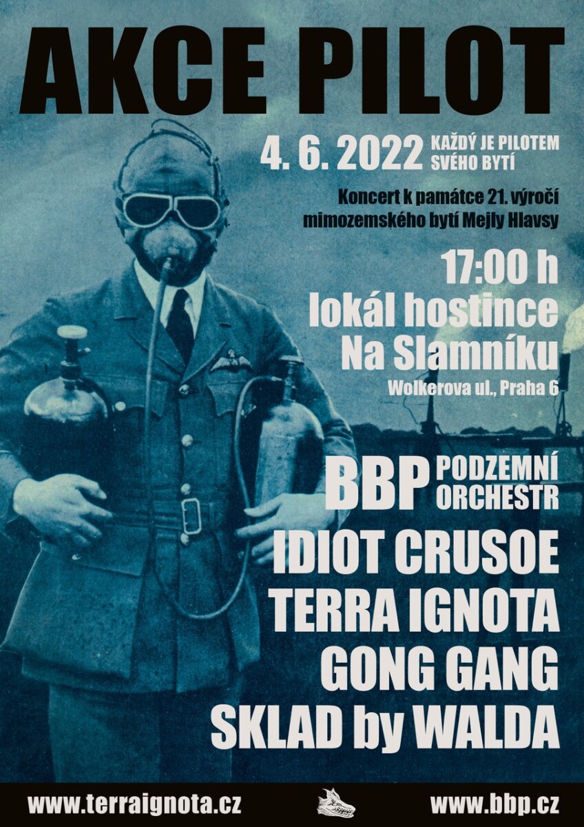 - 283 | 4. 6. 2022, 17:00 h = Hostinec Na Slamníku, Praha 6 – Dejvice, Wolkerova 12: AKCE PILOT No. 13 (již 21 let tu Mejla Hlavsa není…!) + BBP – podzemní orchestr, Idiot Crusoe, Gong Gang a Sklad by Walda; poprvé bez Dany, zato už s Pavlou Přerovskou s její magickou violou ~~~ PLAKÁT