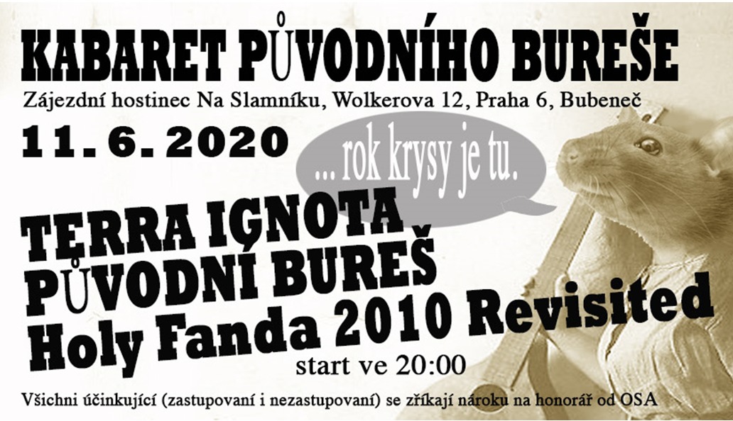 - 278 | 11. 6. 2020, 20:00 h = Hostinec Na Slamníku, Praha 6 – Dejvice, Wolkerova 12: Kabaret Původního Bureše ~ kromě hostitelské kapely ještě vystoupil písničkář Holy Fanda & the Reverends ~~~ PLAKÁT