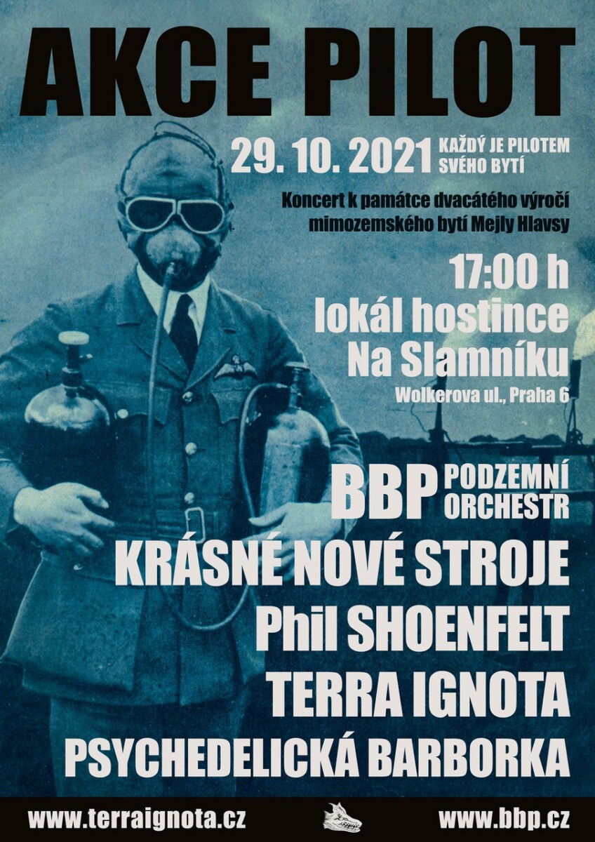 - 281 | 29. 10. 2021, 18:00 h = Hostinec Na Slamníku, Praha 6 – Dejvice, Wolkerova 12: AKCE PILOT No. 12 (již 20 let tu Mejla Hlavsa není…!) + Phil Shöenfelt (GB), BBP – podzemní orchestr, Krásné nové stroje, Psychedelická Barborka ~~~ PLAKÁT